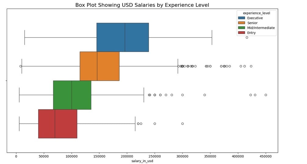 - Comprehensive outlier detection and cleaning using IQR, boxplots and real-world salary benchmarks (Glassdoor validation)